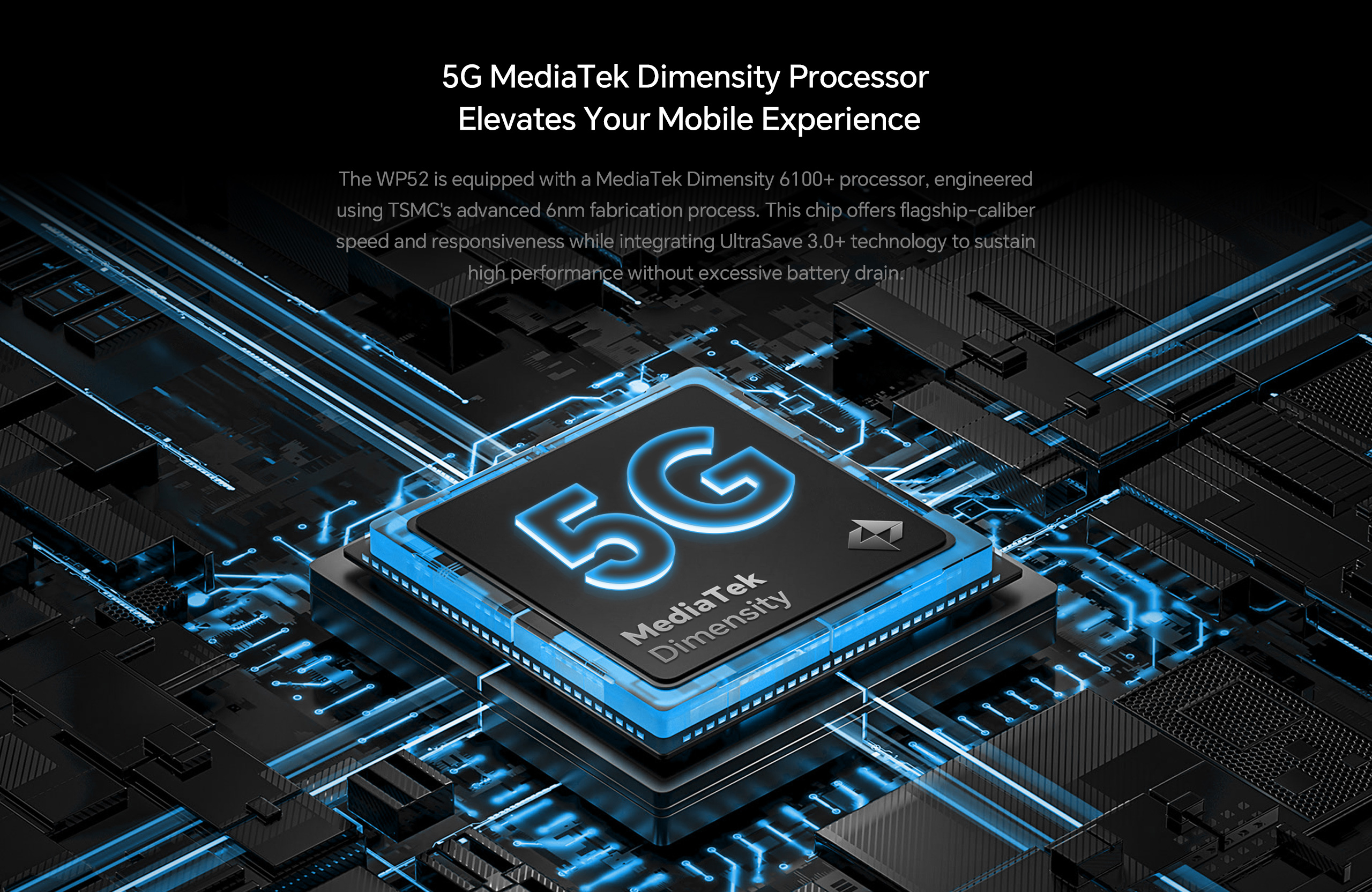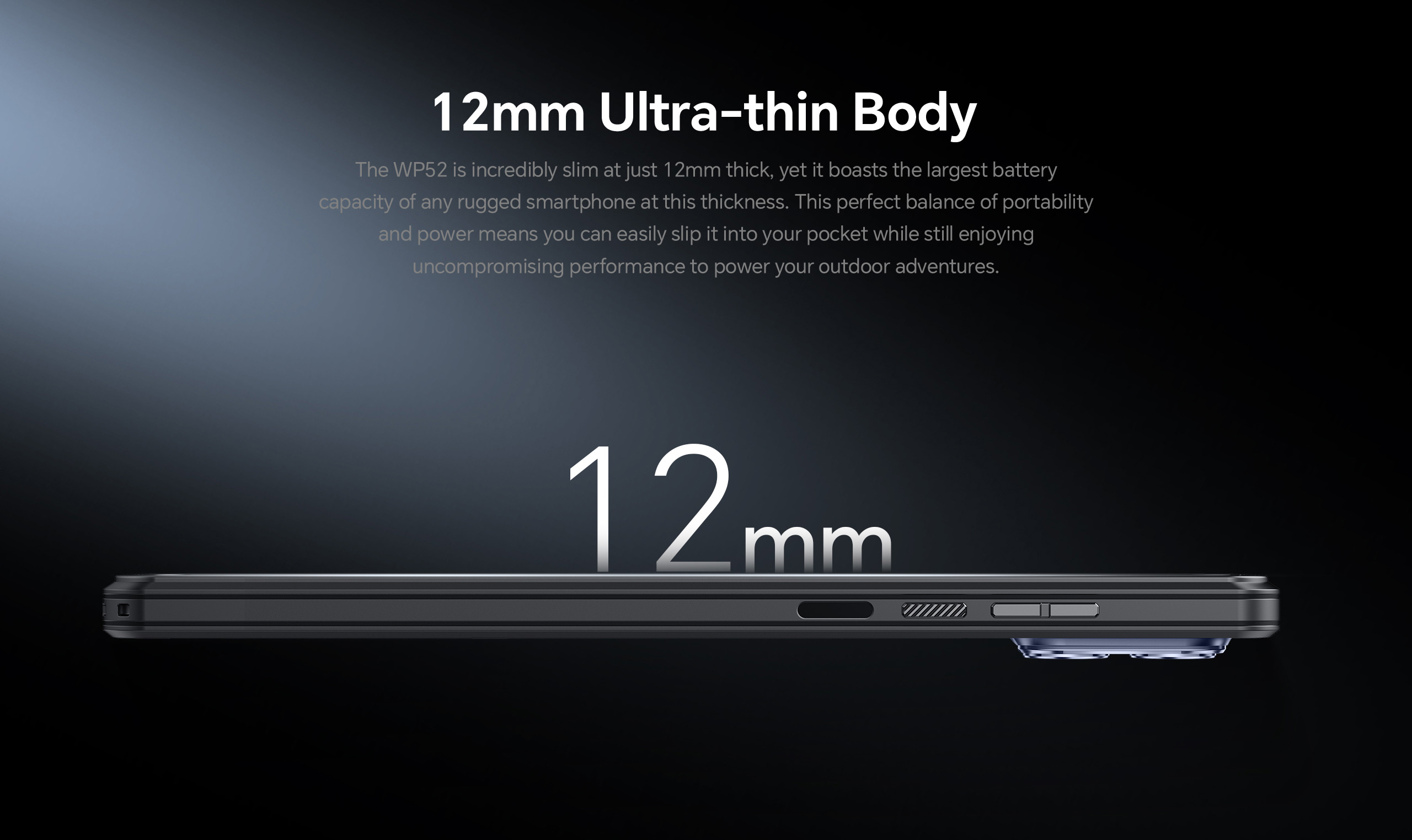 ה-WP52 מצויד במעבד MediaTek Dimensity 6100+ המיוצר בטכנולוגיית 6 ננומטר המתקדמת של TSMC. המעבד מספק לנו מהירות ותגובתיות ברמה של מכשירי דגל, יחד עם טכנולוגיית UltraSave 3.0+ ששומרת על ביצועים גבוהים תוך חיסכון בסוללה – כדי שנוכל להמשיך לעבוד, לשחק ולצלם ללא הפסקה, בכל מקום ובכל זמן.גוף דק במיוחד – רק 12 מ"מ