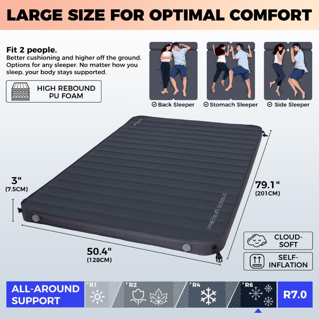 מזרון עבה במיוחד (7.5 ס"מ) עם מבנה ספוג דו־צדדי עשוי בד פוליאסטר אלסטי כולל שסתום לניפוח מהיר, תיק נשיאה ורצועת לקיבוע.